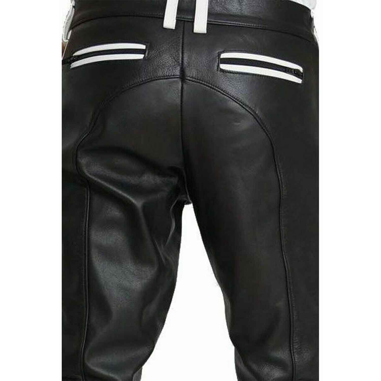 Features: Mens Genuine Cowhide Leather Biker Pants Front button closure for waist adjustment Open front zipper with double sided stitching for BLUF Uniform leather pants Beautiful vibrant color leather stripes gives this a more unique look in its own way Leather straight pants with standard denim style 4 pockets Amazing Hip seams with double stitching gives its wearer a premium comfort while in heavy action ALL BELT LOOPS ARE ALSO IN SAME STRIPE COLOR LEATHER FOR ADDED ATTENTION SEAKER All the material used in this item is of highest quality for durable usage. Made with 100% dedication with love and care by or lovely workers.