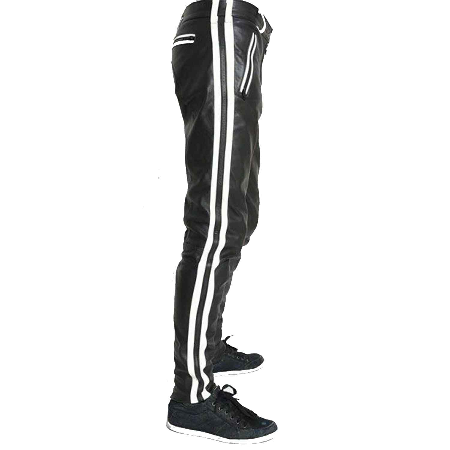 Mens Cowhide Leather Pants Cropped Biker Pants White Stripe Leather Pants Clubwear Chino Trousers
